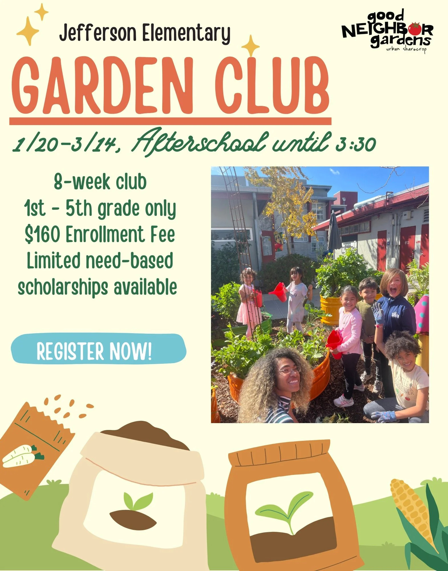 Come play in the dirt and be a Jefferson Elementary farmer. There's so much to explore and discover in the garden, and food always tastes better when you grow it yourself. So come learn about the circle of life. You’ll create living food, harvest it, prepare it, taste it, and share it with your community of friends, family and neighbors.
