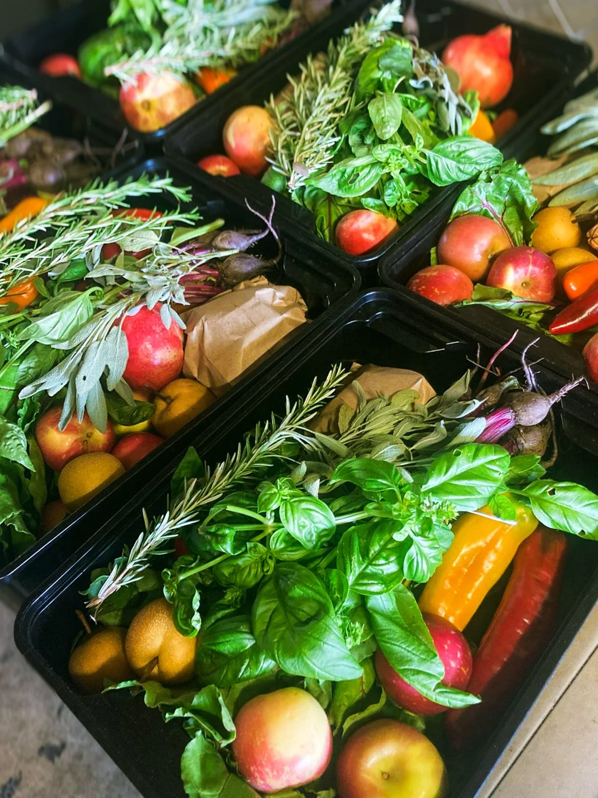 Get a mix of 10-14 freshly regenerative fruits and vegetables grown in our residential gardens and at our local, small-scale regenerative farm partners.
