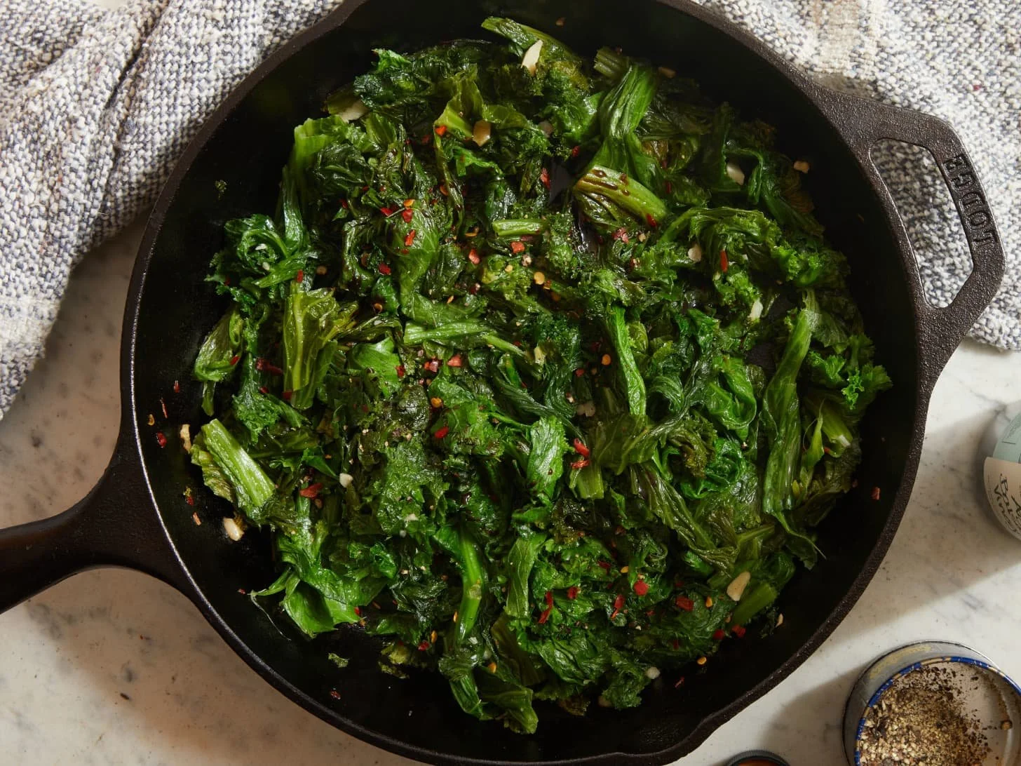 Heat 2 tablespoons olive oil in a large, wide, high-sided sauté pan over medium heat until shimmering. Add the garlic and 1/4 teaspoon red pepper flakes if desired. Cook, stirring, until fragrant, about 1 minute (do not let the garlic brown).